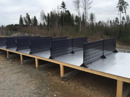 Test av en hel ny typ av solceller, som monteras vinkelrätt mot underlaget och ger mer effekt morgon och kväll. Framtagna av svenska PPAM. I projektet används en yta av 100 kvadratmeter, som ”normalt” räcker till att producera ca 14 kW solel, för att producera ca 25 kW solel.